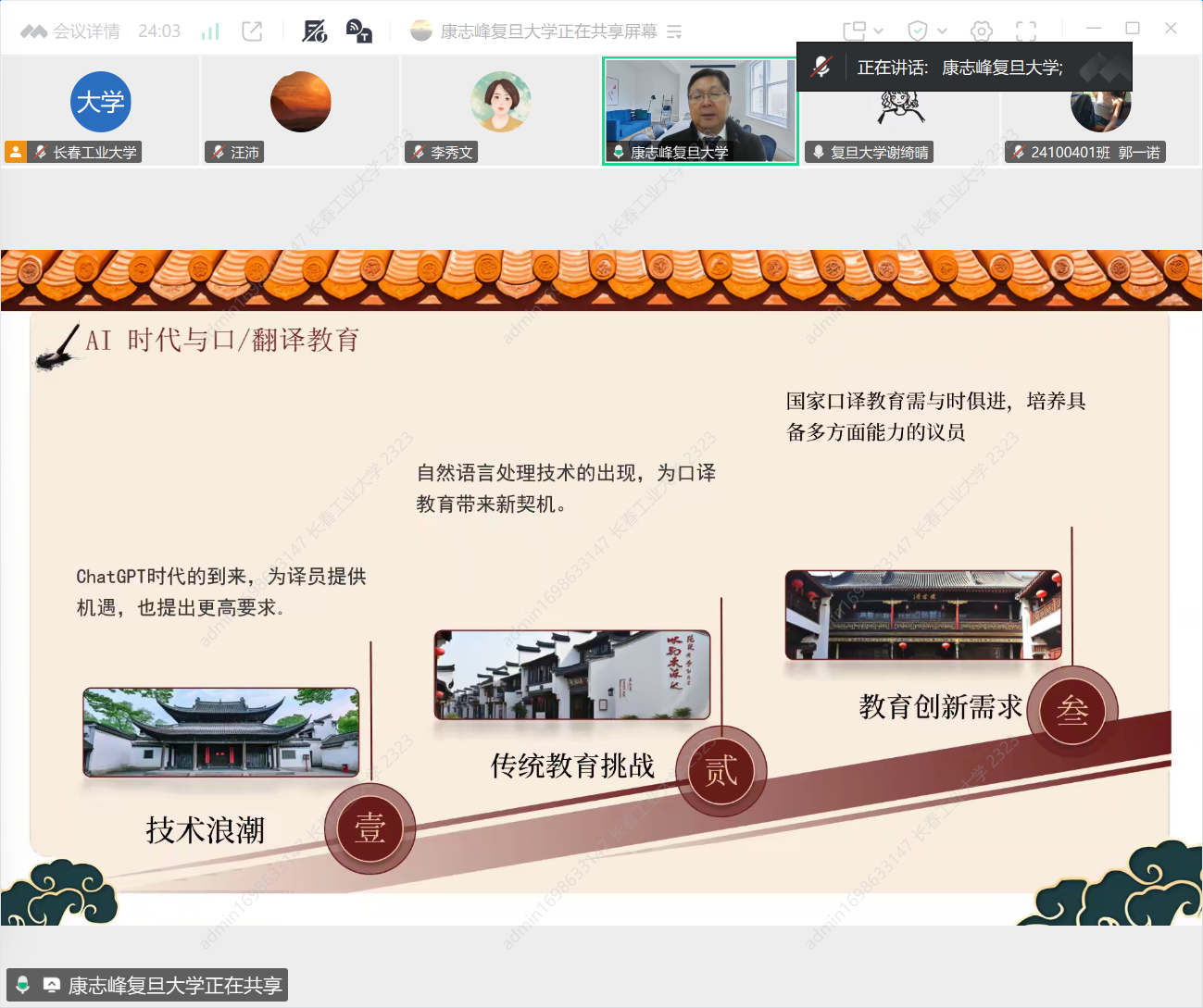 康志峰教授围绕“AI的迅猛发展为翻译领域带来了革命性变革,催生了理论与实践研究的新向度”这一主题 ,从AI+大翻(口)译、体认口译学溯源、体认口译学定义、论要解析1-4、视译眼动实验(福州大学)、带稿同传眼动实验(复旦大学)等六个方面,具体阐述了AI赋能下翻译研究范式如何进行转型,并鼓励在场师生思考:AI赋能下翻译研究在理论和实践层面如何进行创新?康教授强调:“未来的翻译研究应聚焦于人机智能的深度融合,探索构建新型翻译批评标准与人才培养体系,以应对数智时代的新挑战与新机遇。”