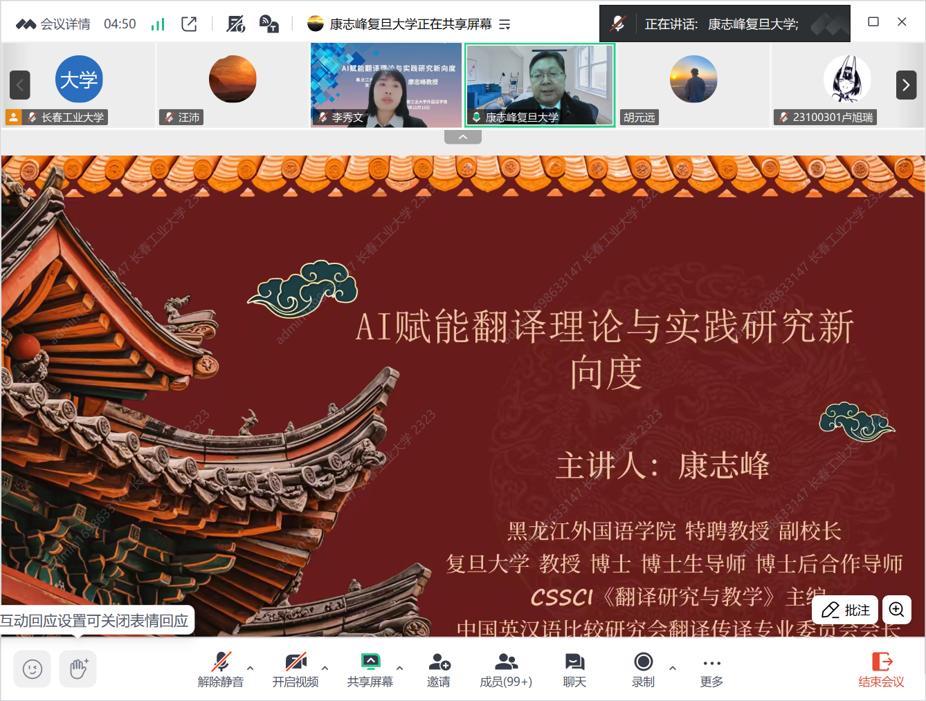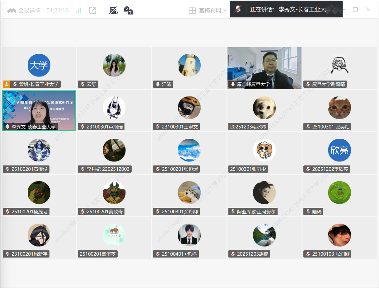 师生线上作了题为《AI赋能翻译理论与实践研究新向度》的学术报告。学院院长李秀文、副院长曾妍、各系部教师、研究生及本科生近500人聆听了这场精彩的学术报告会,会议由李秀文主持。