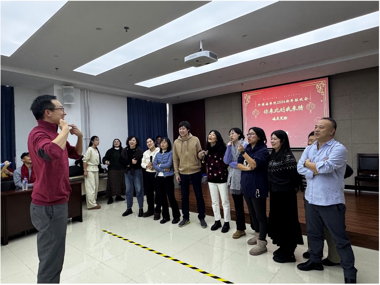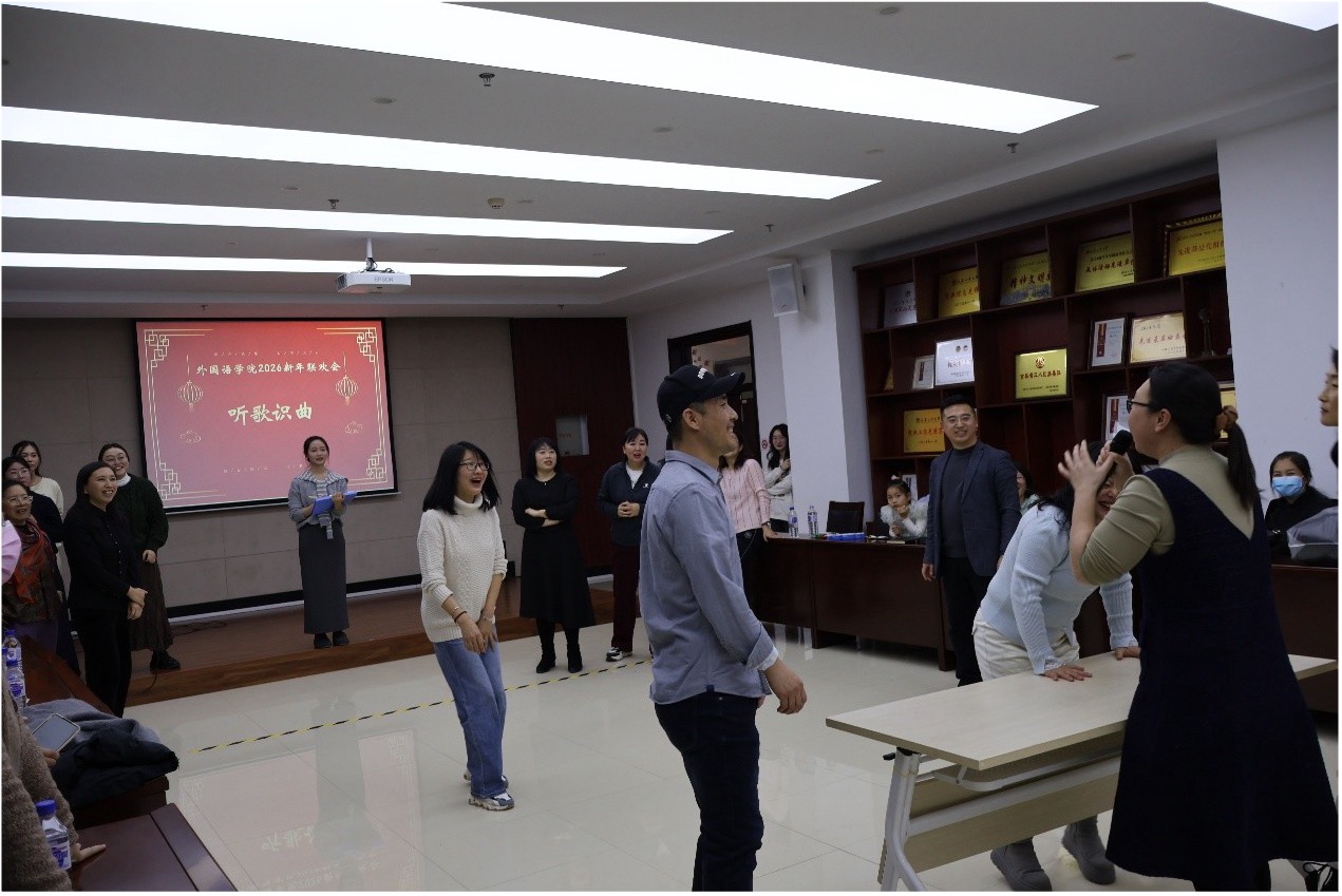趣味竞技,同心聚力。全体教师分为四个小组,依次展开“你比划我来猜”“小球传不停”“五块一毛手拉手”“听歌识曲”四项游戏比拼。各组成员默契配合、奋勇争先,展现出如骏马奔腾般的昂扬斗志与协作精神,现场气氛热烈,欢声不断。