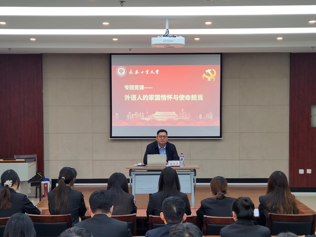在学院多功能报告厅举办“外语人的家国情怀与使命担当”专题党课。本次党课由学院党委书记张子宇主讲,学院师生党员代表、入党积极分子及党员发展对象共同参加学习。